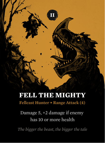 Eager to earn their place among the clan’s legends, Fellcast Hunters are the youngest of the Boulderbreakers, still short of beard but fierce in spirit. Too young to join the shieldwall, they instead take to the wilds, proving their worth the only way they know how: by bringing down the greatest beasts the Wyldwood has to offer. Expert trackers and cunning trappers, they move with patience and strike with precision, hurling relic javelins passed down through generations. Each javelin bears the carved stories of legendary kills, and with every throw, the hunter hopes to add their own tale to its worn shaft. In the eyes of the clan, a hunter is measured not by words, but by the size of their trophies.